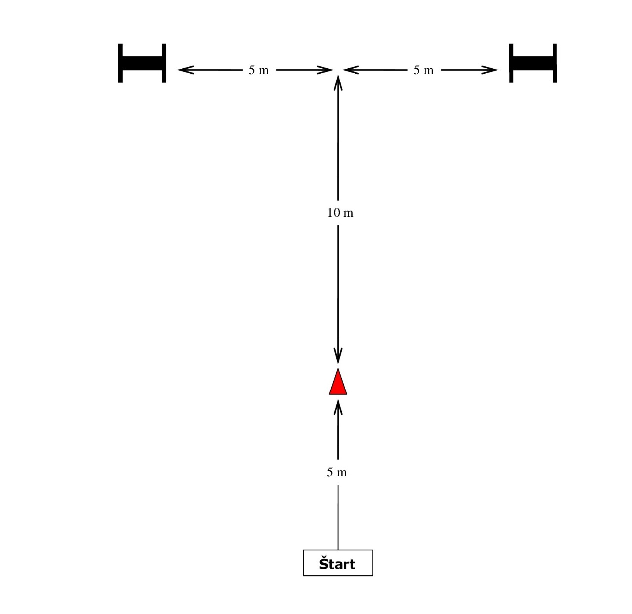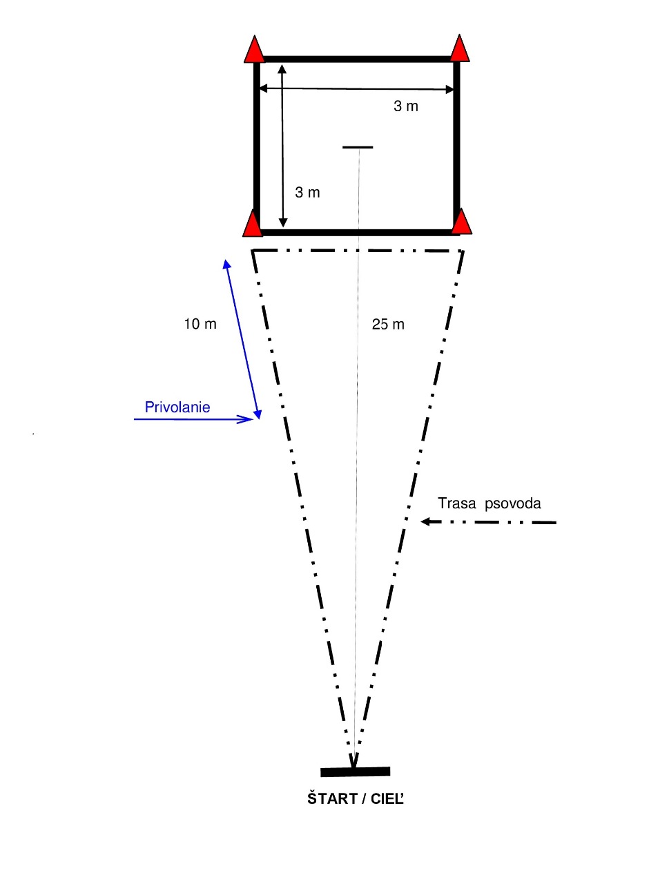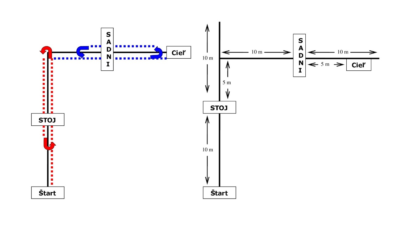 Vykonanie: Psovod a pes stoja na východiskovom bode tvárou ku kužeľu, ktorý je vzdialený od nich približne 5 m. Steward položí dve drevené činky vzdialené od seba približne 10 m tak, aby boli dobre viditeľné. Činka, ktorá sa bude aportovať (ľavá alebo pravá) je položená na zem ako prvá. Kužeľ je umiestnený približne v strede pomyselnej priamky, ktorá spája činky a je približne 10 dlhá a východiskový bod je vzdialený približne 15 m kolmo na stred tejto priamky (pozri schému). Psovodovi je velené, aby spolu so svojim psom vykročil z východiskového bodu smerom ku kužeľu a umiestnil psa do polohy stoj vedľa kužeľa (v okruhu 1 m) tak, aby pes videl na východiskový bod pokiaľ psovod bude odchádzať od psa a vracať sa do východiskového bodu. Psovod sa nesmie obzerať, pokiaľ odchádza od psa. Približne po 3 sekundách, po tom čo sa psovod vráti do východiskového bodu, steward dá pokyn, aby vyslal psa k správnej činke určením smeru. Pes by mal priniesť a odovzdať činku korektne. Musia byť k dispozícií 3 veľkosti činiek (v zmysle časti II. bod 13). Veľkosť činky by mala byť primeraná veľkosti psa, avšak psovod sa môže rozhodnúť, ktorú si vyberie.